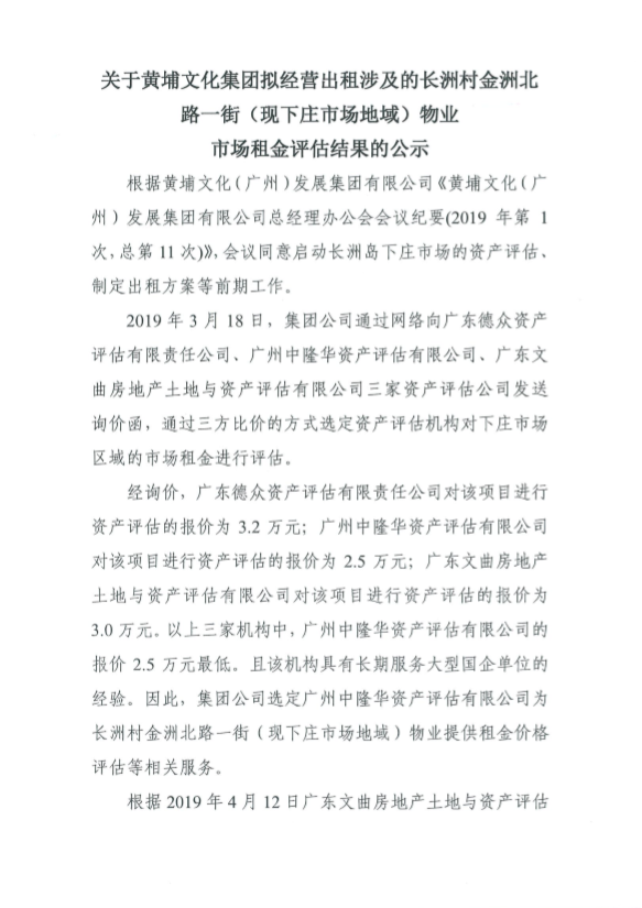 公示:关于黄埔文化集团拟经营出租涉及的长洲村金洲北路一街(现下庄市场地域)物业市场租金评估结果的公示