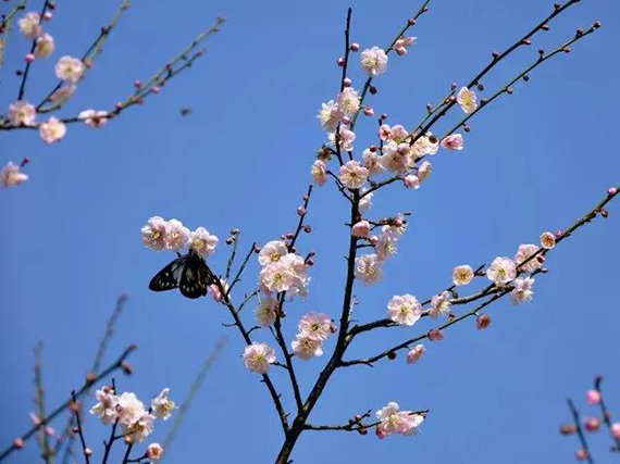 今年第一次到萝岗香雪,梅花才刚刚开。花开得疏朗,比密挤时更加淡雅秀丽。一粒一粒明晰的白花仿佛十万星辰,渐渐沁入靛蓝的天幕中。蜂蝶闻到早梅的香,成群结队地赶来了。梅林中常见一种彩蝶,黑底上撒着橙红鹅黄蛋白的斑点,停落在白梅上恰恰相宜,是秾蝶恋素花。